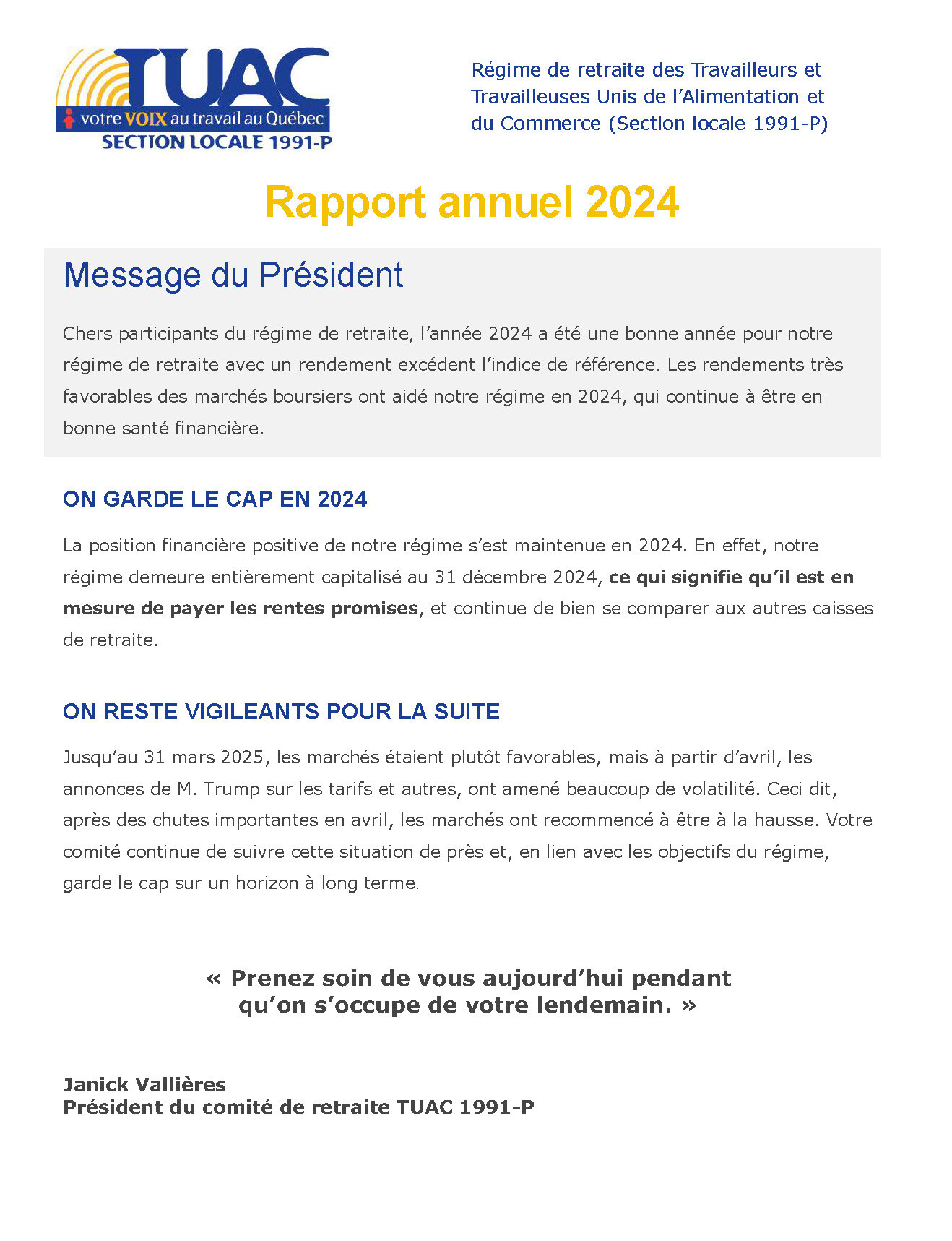 Chers participants du régime de retraite, l’année 2024 a été une bonne année pour notre régime de retraite avec un rendement excédent l’indice de référence. Les rendements très favorables des marchés boursiers ont aidé notre régime en 2024, qui continue à être en bonne santé financière.